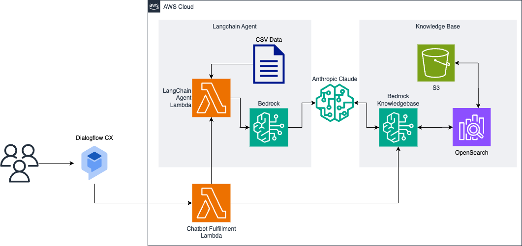 The chatbot employs Google Dialogflow CX for its conversational AI capabilities, ensuring a robust and interactive user experience. For fulfillment, AWS Lambda functions are utilized, enabling the execution of backend code in response to specific intents identified by Dialogflow CX. This setup allows for dynamic data retrieval and processing, facilitating accurate and contextually relevant responses. AWS Lambda works in tandem with AWS API Gateway, AWS DynamoDB, and other AWS services to provide a seamless and efficient solution for handling user queries and managing data.